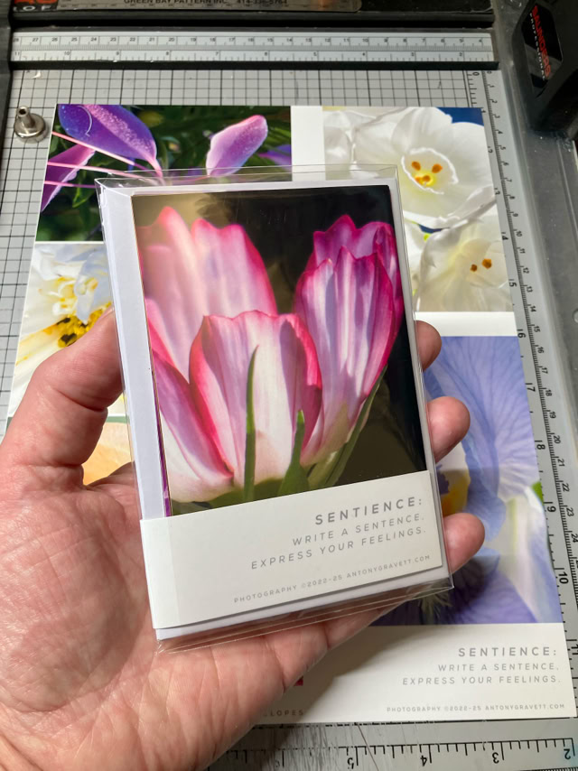 “SENTIENCE” are sets of five small photo cards with mailable envelopes — just the right size for a quick thank-you or stay-in-touch message.